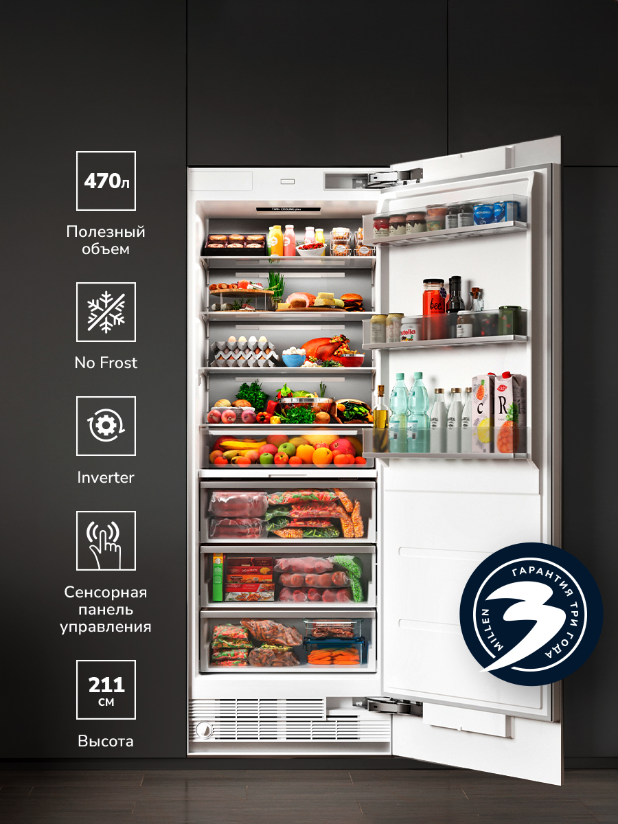 Встраиваемый двухкамерный холодильник MBI 193.7D займет достойное место на вашей кухне. С объемом 341 л пространства в отделениях хватит для хранения всех продуктов и блюд даже в долгие праздники. Холодильник работает от современного компрессора инверторного типа, быстрого и стабильного. Холодильная и морозильная камеры оснащены системой No Frost, понятной электронной панелью управления, режимами охлаждения и заморозки для разных ситуаций. Когда нужно максимально охладить сразу много продуктов, можно активировать быструю заморозку или охлаждение, а функция поддержания температуры очень пригодится, если возникнут неполадки с электропитанием. Стеклянные полки в рабочей камере и боковые полки на дверце холодильника имеют надежную систему фиксации, но при этом их можно легко переставлять или снимать; в комплекте также идет полка для напитков. Все это делает использование холодильника и уход за ним проще и удобнее.
