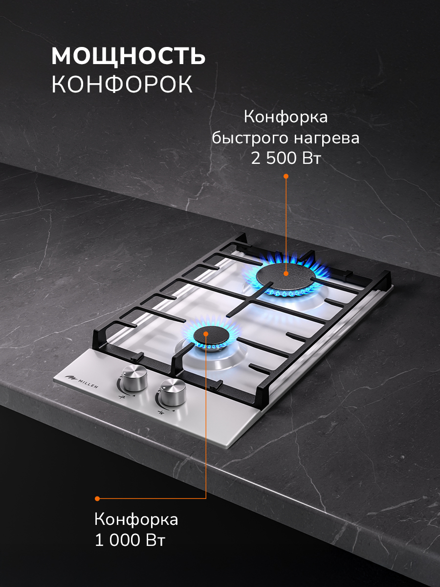 Регулировка пламени осуществляется удобными механическими переключателями путем нажатия на них и поворота до требуемой отметки. Если отсутствует электричество, то конфорки можно аккуратно поджечь спичкой, предварительно подав на них газ. Всего на панели две зоны подогрева. Одна из конфорок повышенной мощности. Для подключения панели к газовому баллону есть специальные жиклеры в комплекте, докупать отдельно ничего не потребуется.