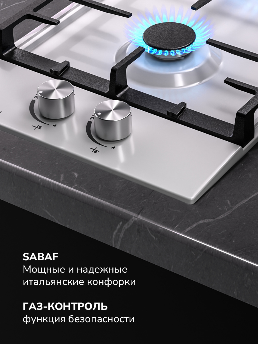 Массивные чугунные решетки в комплекте удобны в повседневной эксплуатации и обладают высокой устойчивостью к механическим повреждениям. Функция автоматического поджигания конфорки позволяет быстро привести газовую панель в рабочее состояние и начать готовить любимое блюдо.