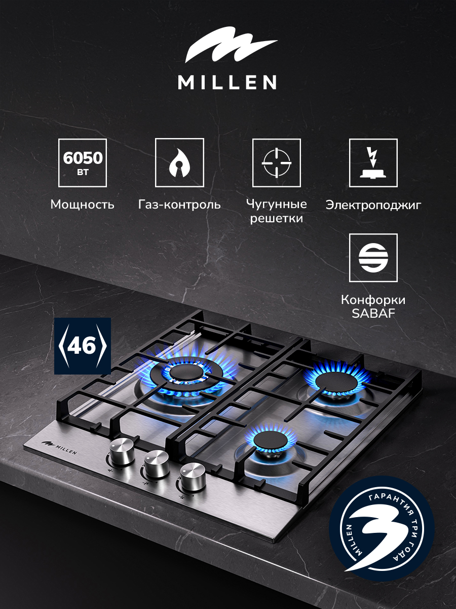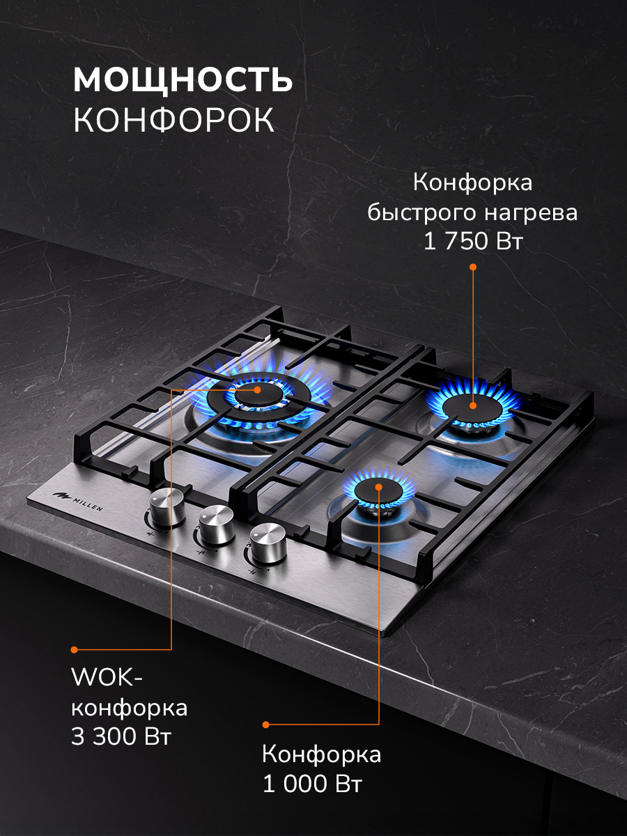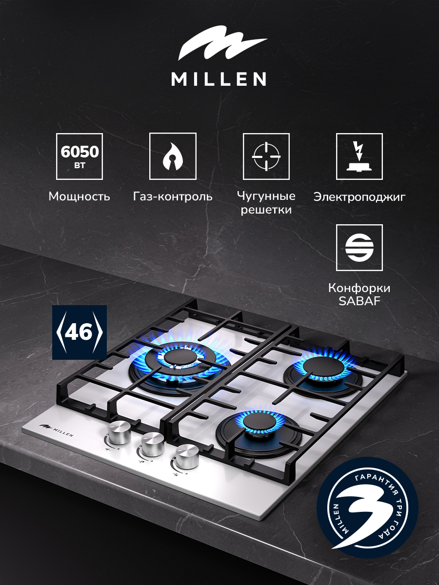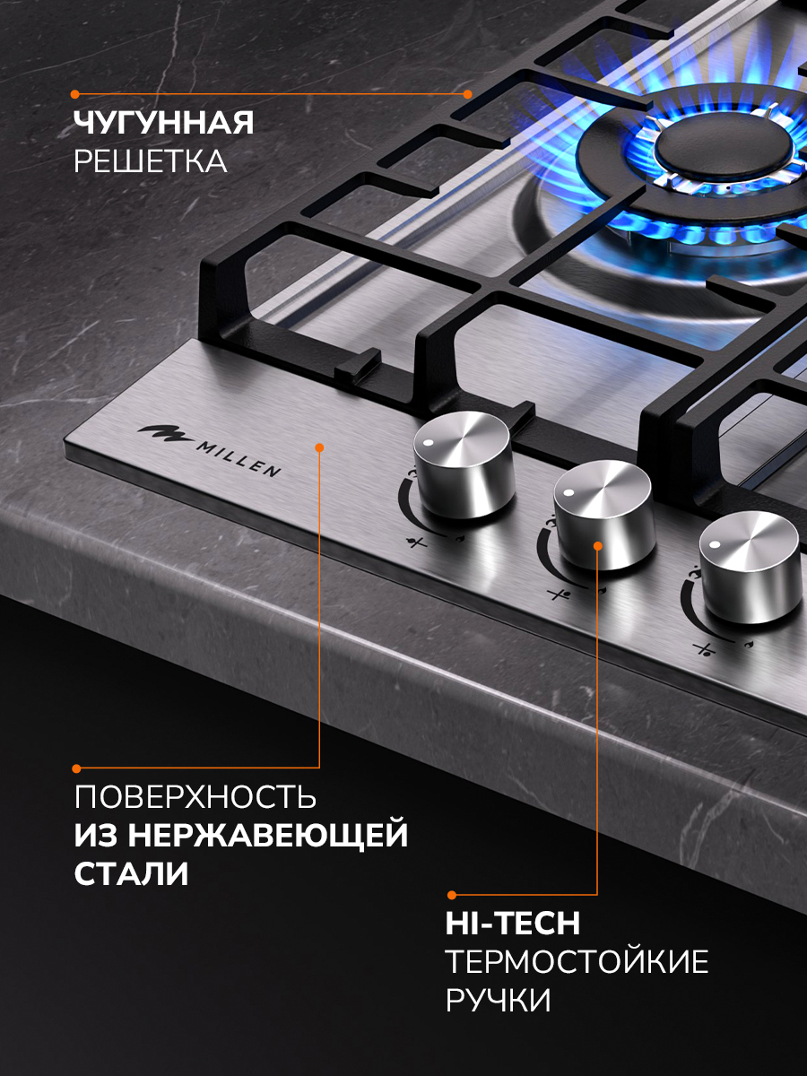 Встраиваемая варочная панель MGH 451 IX с газовым подключением отличается компактными габаритами и хорошей функциональностью. Возможно подключение с использованием газового баллона. Для этого в комплекте есть набор специальных жиклеров. Всего пользователю доступно три рабочих зоны с достаточным расстоянием между ними. При необходимости, можно готовить сразу на всех конфорках, места для размещения посуды хватит.