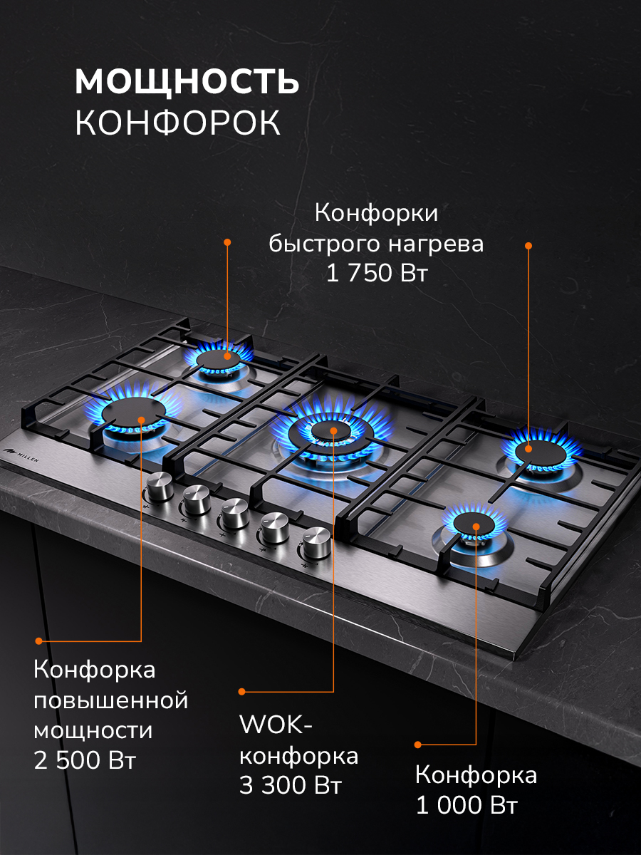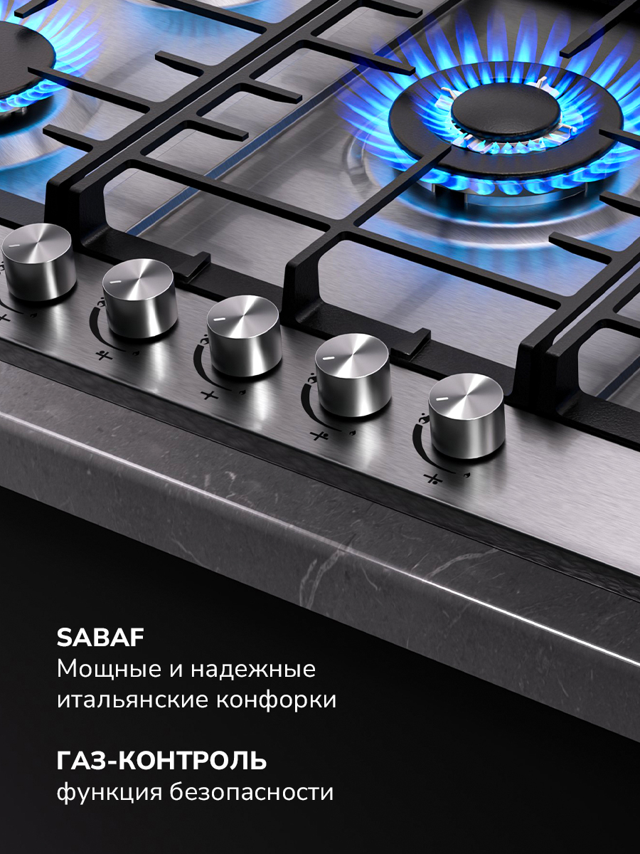Наличие пяти конфорок разного типа и мощности позволяет легко подбирать подходящую температуру и готовить одновременно несколько блюд. На поверхности достаточно свободного места для размещения любой объемной посуды. В центральной части панели находится WOK-конфорка, создающая во время работы сразу несколько колец пламени. Такая особенность позволяет моментально нагревать даже крупную посуду, что открывает возможность готовить блюда азиатской кухни любой сложности в домашних условиях.