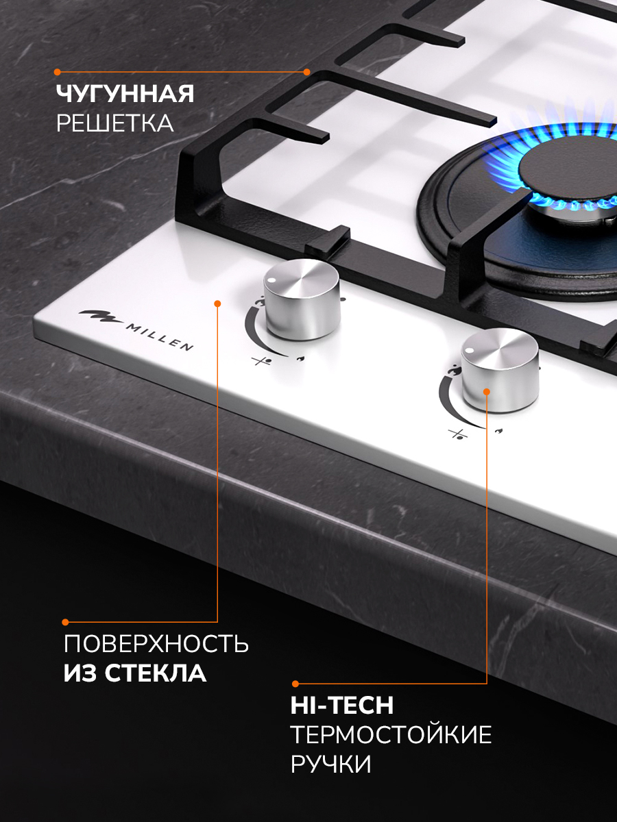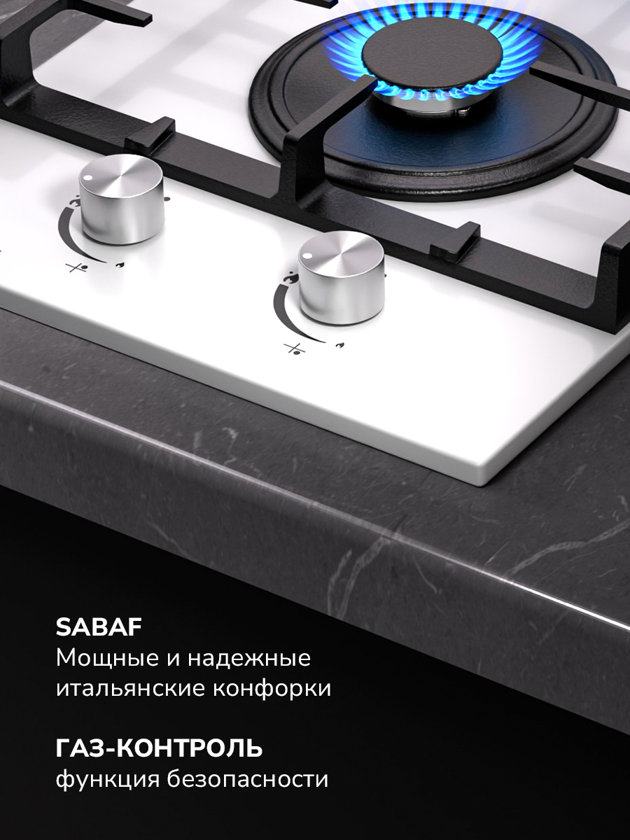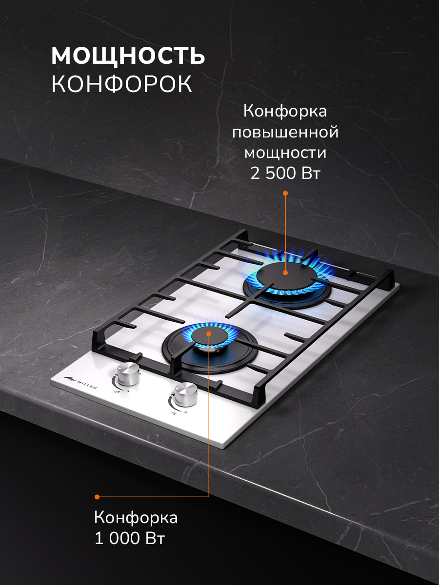 Газовая варочная панель MGHG 301 WH идеально впишется в интерьер любой дизайнерской кухни и сэкономит много свободного пространства за счет компактных габаритов. Благодаря функции электрического розжига приготовление любых блюд станет намного быстрее. Управление осуществляется с помощью термоустойчивых переключателей механического типа. Для подачи газа и искры, необходимо утопить ручку и повернуть в требуемое положение.