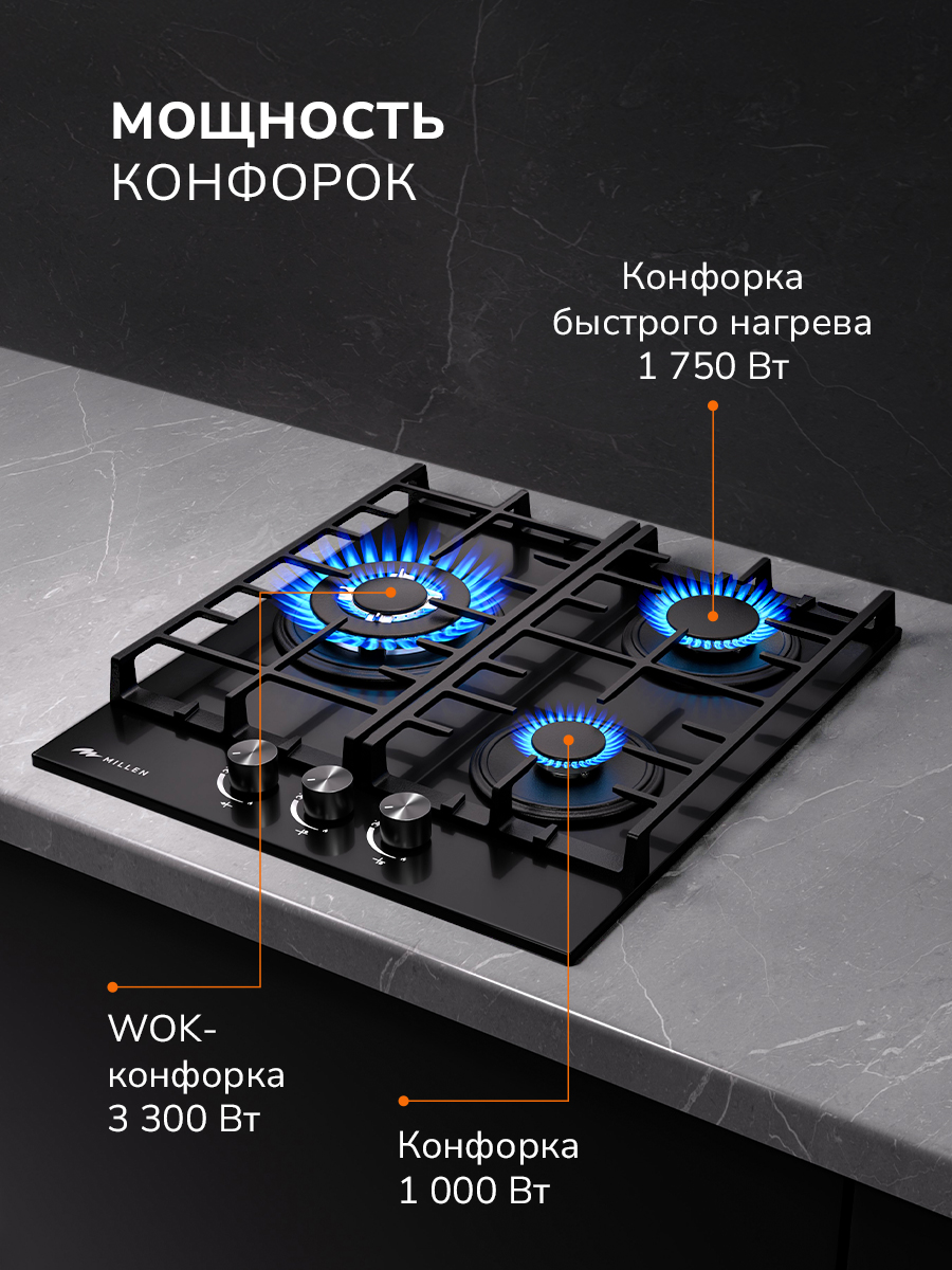Управление интуитивно понятно. Всего есть три термостойких ручки, каждая из которых отвечает за включение и выключение отдельных конфорок. Просторное рабочее пространство позволяет перемещать по поверхности посуду любых объемов. Наличие WOK-конфорки открывает возможность приготовления изысканных блюд азиатской кухни, используя специальную посуду или большие кастрюли.