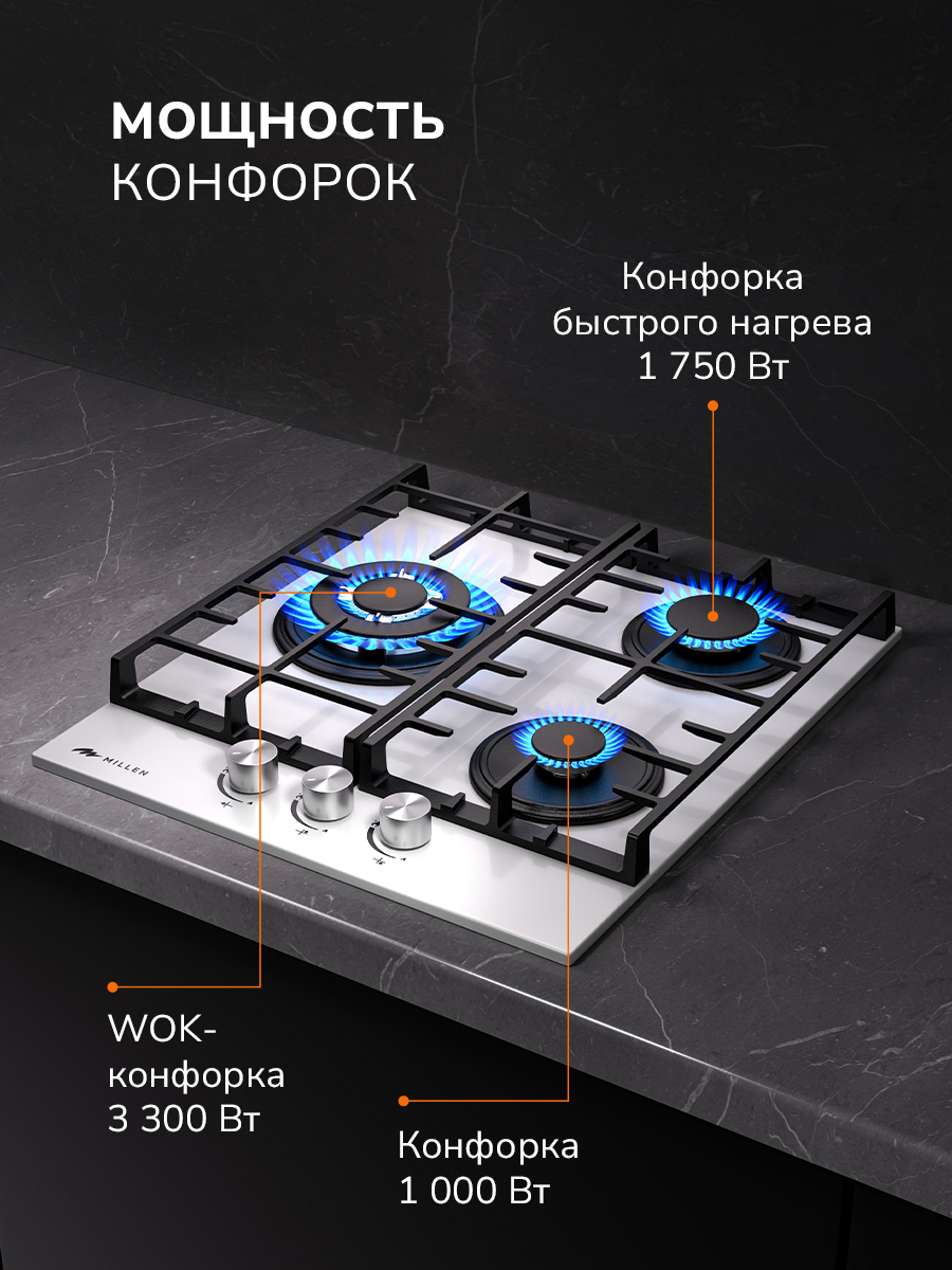 Особый интерес представляет рабочая зона с WOK-конфоркой. На ней можно приготовить практически любое популярное блюдо азиатской кухни в домашних условиях, используя кастрюли больших объемов или специализированную посуду. Две другие конфорки выполняют стандартные функции и отличаются только мощностью.