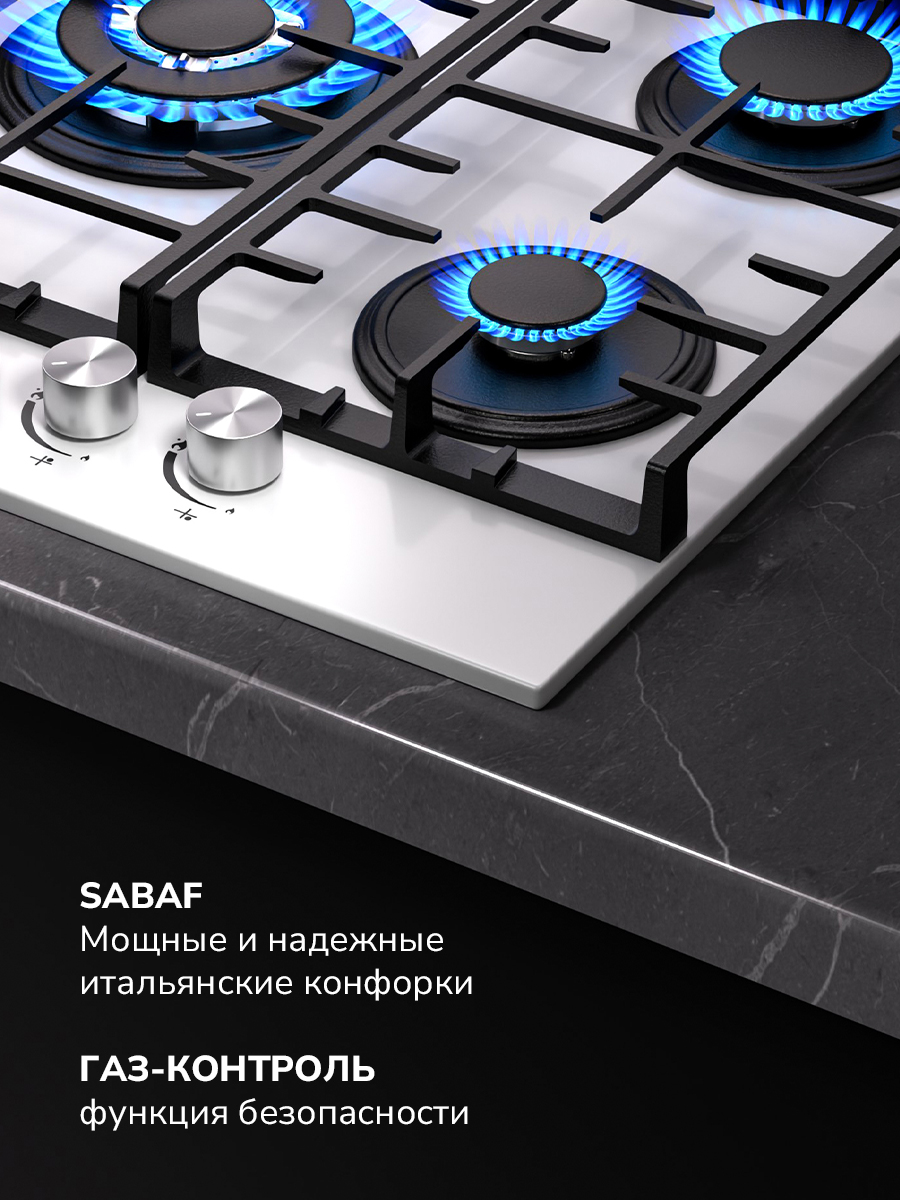 Управление варочной панелью осуществляется посредством термостойких поворотных переключателей, каждый из которых отвечает за отдельную конфорку. Функция автоматического розжига позволяет привести в рабочее состояние любую конфорку легким движением руки. При отсутствии электричества данная опция будет недоступна и потребуется воспользоваться спичками или зажигалкой. В комплекте есть дополнительный набор жиклеров, предназначенный для конверсии газа.