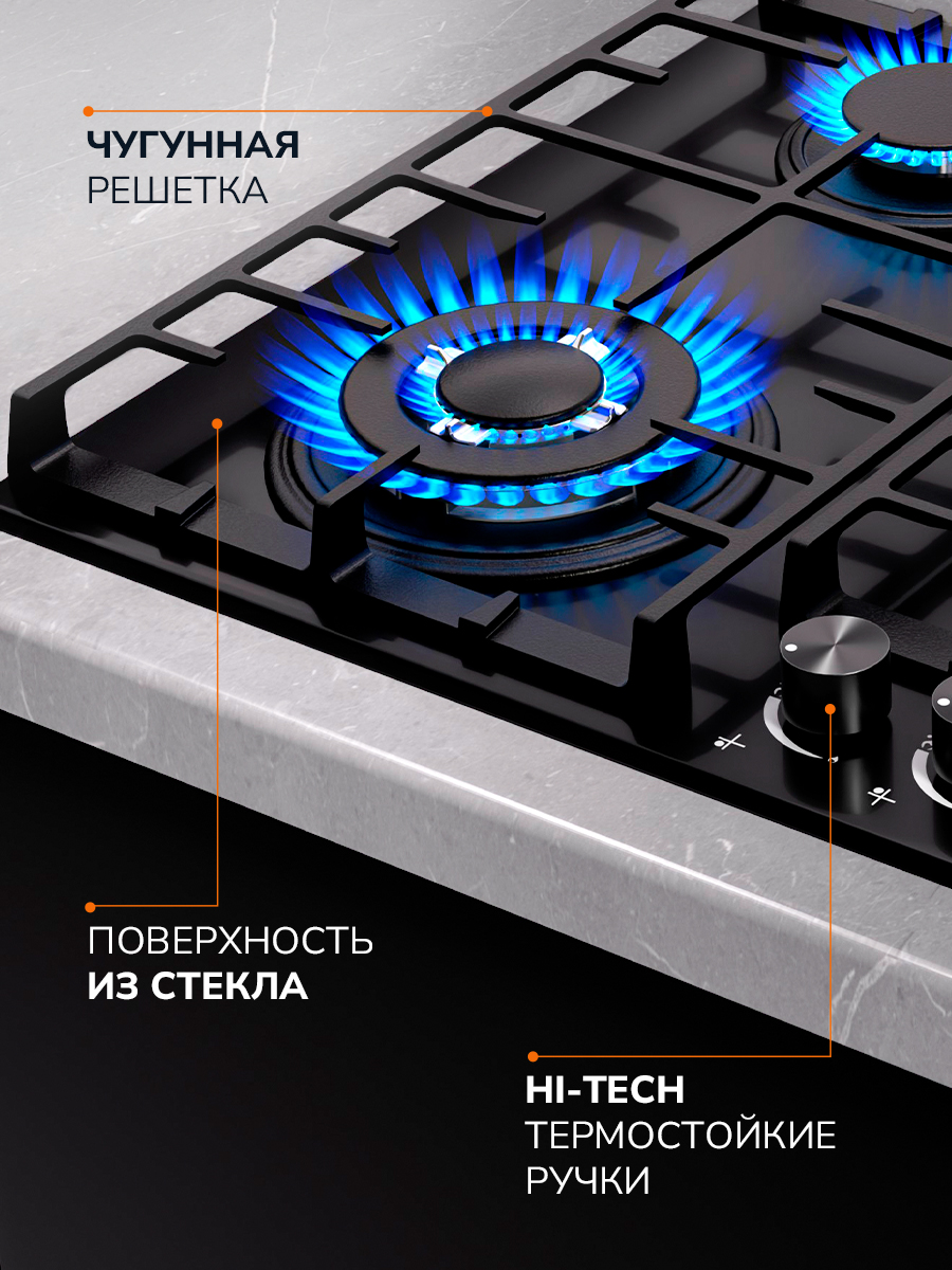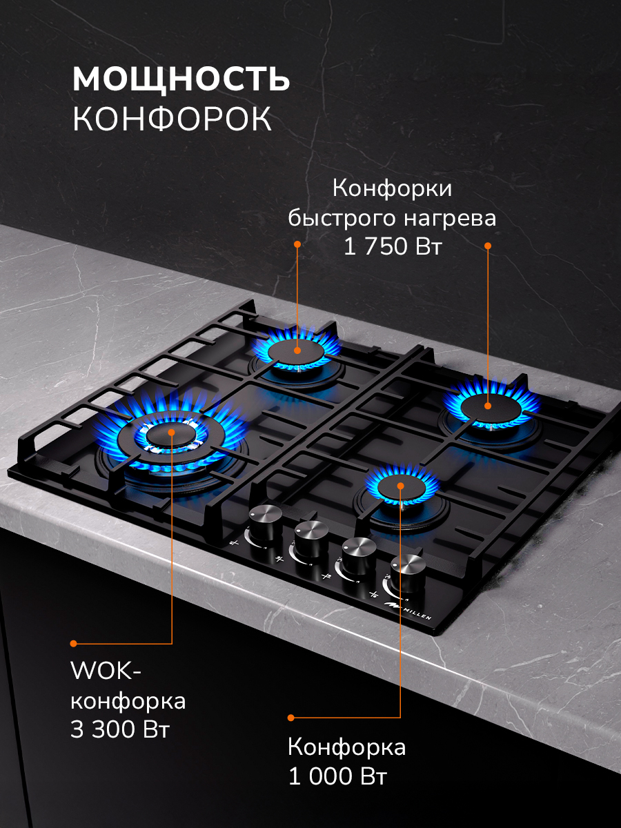 Пользователю доступно четыре конфорки, отличающиеся диаметром и мощностью. Это позволяет быстро выставить оптимальную температуру для одновременного приготовления сразу нескольких блюд. Наличие WOK-конфорки с повышенной мощностью открывает возможность в домашних условиях готовить изысканные блюда азиатской кухни. Для этого используются большие кастрюли или специализированная посуда.