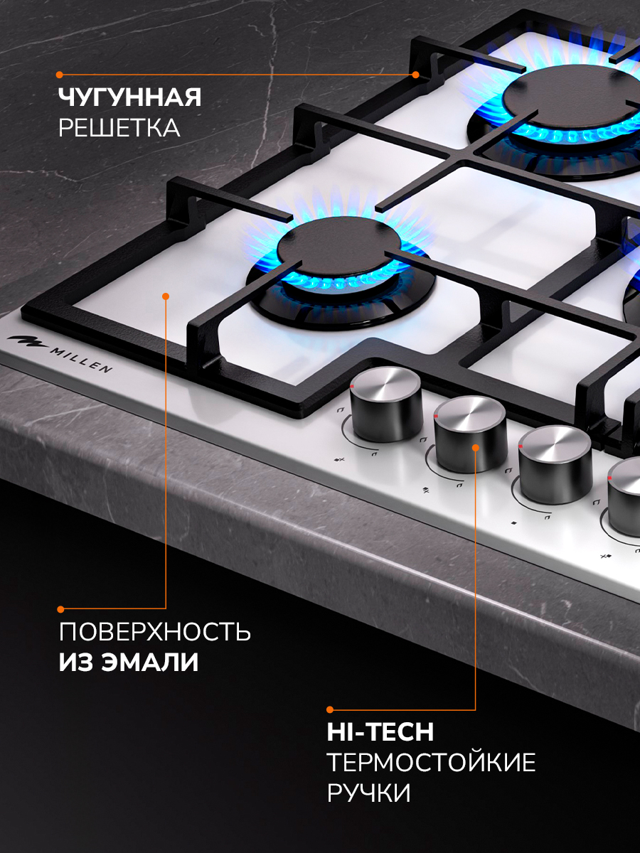 Высококачественные чугунные решетки удобны в повседневной эксплуатации. Любая посуда на них стоит устойчиво и не скользит во время взаимодействия с ней. Если пламя случайно погаснет во время приготовления пищи, то подача газа будет прекращена в автоматическом режиме, что существенно повышает безопасность.